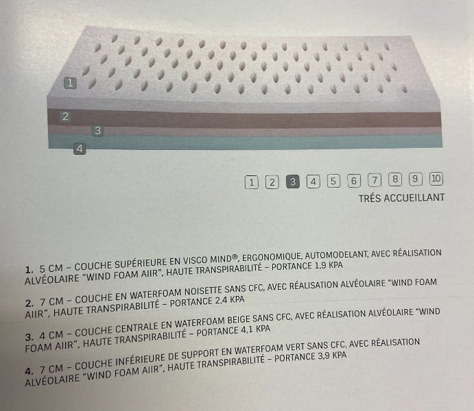 Le matelas Cortona utilise les propriétés innovantes comme le Memory viscoélastique, du Waterfoarm et du Bio Memory. Le Mémory viscoélastique s’adapte parfaitement à toute la surface du corps, assurant un soutien correct de la colonne vertébrale. Le Waterfoam est une mousse à base d’eau qui favorise la bonne répartition du poids, ce qui entraîne une relaxation musculaire complète. Le Bio Memory ajoute aux caractéristiques d’élasticité, de respirabilité et de confort. Ce matelas d’un confort souple allie le côte rebondissant grâce à sa viscoélastique et son côté extrêmement respirant grâce aux larges alvéoles qui le traversent. Ce matelas est entièrement déhoussable.