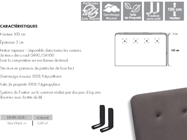 - Système de fixation sur le sommier réalisé par des jeux de glissières (fournies avec la tête de lit)